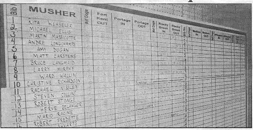 their way. They are also responsible for updating a large dry-erase board with the list of 250 participants, which many family members, handlers, and other mushers stop by to check regularly. Another interesting decorative feature of the .headquarters is a map of the United States and Canada, with push pins representing the hometowns of all the mushers for the year's races. The mushers who traveled the furthest this year were Rick Larson (the Crown 250 winner) and Laura Daugerau (who finished ninth in the Can-Am 60 race), both of whom hail from Sand Coulee, Montana. "This is the hub of the whole Can-Am operation," explained Bennett. "All information comes in here. It's a huge job." Can-Am Central is manned 24 hours a day during the race, with volunteers working in shifts to ensure seamless coverage of the headquarters: French. and English, Valley French and Quebecois French, all mingle together in the headquarters, which became crowded following the awards ceremony. The volunteers trade-off between socializing and responding to visitors' inquiries and taking down information as it is received from the checkpoints and calling various checkpoints to update their information. One visitor, "one of our favorite regulars" explained Labrie, told of his touch with Hollywood: he appeared in several scenes in the dog sledding Disney film Iron Will. A local resident, after speaking with one Of the -- mushers from the shorter races, said, "I speak French. But monsieur over there, he speaks 'French French'." Others, including handlers' and spouses, quickly jotted down the updated information from the dry erase board, then pulled out their cell phones to give updates to those "from away". For the uninitiated or simply curious, Can-Am headquarters should be a required stop during visitors' Can-Am experience. For those far away from Fort Kent; the website provides the next best thing. Through the work of the volunteers in this information hub, as well as those at checkpoints and elsewhere during the races, the times and other racing data remain accurate throughout the Can-Am Crown races for those in town, on the course, or across the world. |